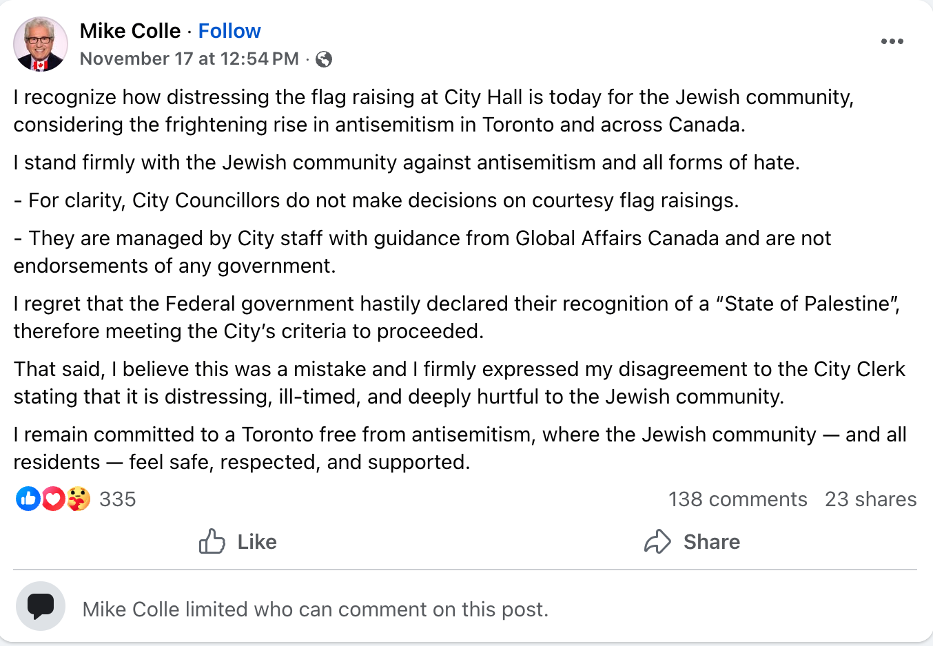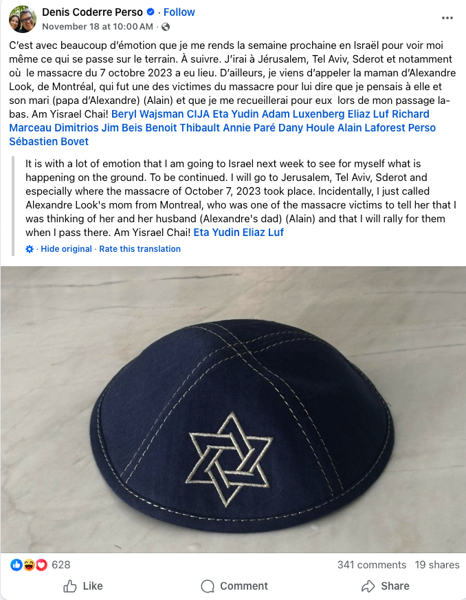 Ia juga menyebutkan antisemitisme yang marak di Kanada, dengan mengklaim bahwa “Orang-orang Yahudi [merasa] takut untuk memakai Bintang Daud di tempat umum.”