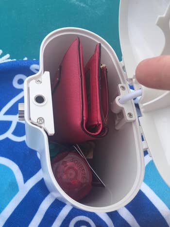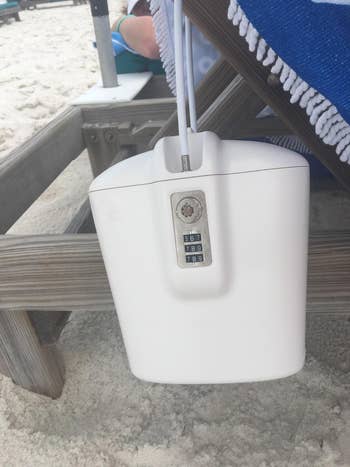 35. Akotak kunci portabelyang dapat menempel pada payung pantai, meja piknik, atau kursi Anda sehingga Anda dapat menyimpan ponsel, kunci, dompet, dan barang berharga lainnya dengan aman dari siapa pun yang memiliki tangan licin. Para peninjau menyukai penggunaan ini di pantai, hotel, bahkan taman air!