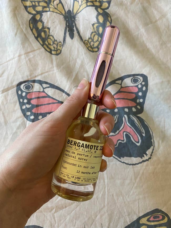 36. Pengisi ulang berukuran sakupengatur wewangian perjalananjadi Anda bisa membawa parfum favorit Anda kapan saja dan tidak perlu khawatir tentang kebocoran yang berbau bunga di tas, koper, atau tas olahraga Anda! Daripada memerlukan corong, atomizer ini hanya perlu terhubung ke nosel botol parfum Anda untuk pengisian yang mudah.