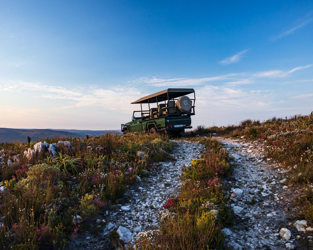 Jalan Botani: Sebuah kendaraan 4×4 dengan sistem penggerak empat roda di Land Rover terbuka menawarkan pemandangan tak berujung dari bidang bunga dan lautan. Kami berhenti di Galeri Seni Botani Hannarie Wenhold, di mana kisah lingkungan fynbos ditangkap dalam karya seni yang detail.