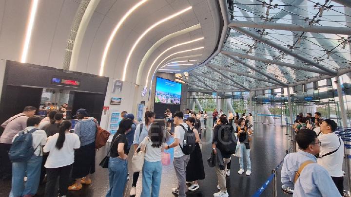 Antrean wisatawan memasuki lift di dalam Canton Tower, Guangzhou, Provinsi Guangdong, Cina, 16 Oktober 2025. Tempo/RR Ariyani