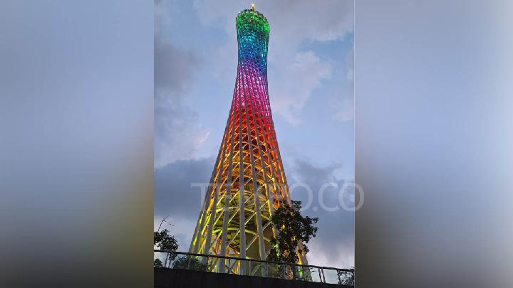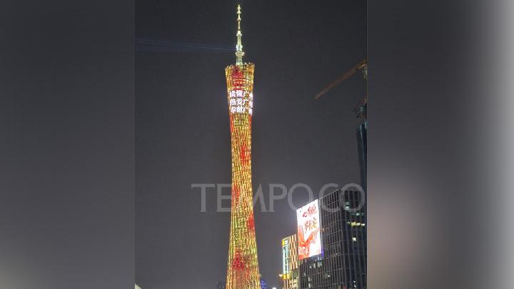 Canton Tower di Cina tampak terlihat dari kapal pesiar yang ditumpangi saat mengarungi Pearl River di Guangzhou, 16 Oktober 2025. Tempo/RR Ariyani
