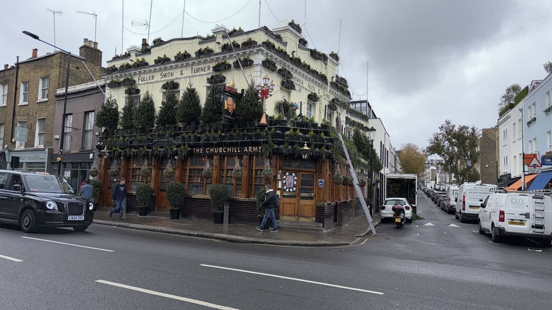 Tahun ini, pub telah mengurangi – tetapi hanya sedikit. Hanya ada 55 pohon di luar tahun ini, semua berasal dari City Plant Displays, yang telah bekerja sama dengan Churchill Arms untuk menghiasnya selama 30 tahun.