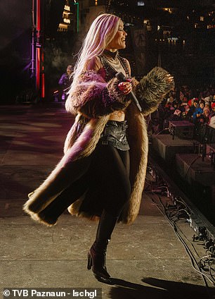 Rita Oraberani menghadapi dingin dengan pakaian yang menarik saat dia tampil di Konser Pembuka Puncak Gunung Ischgl di Austria baru-baru ini.